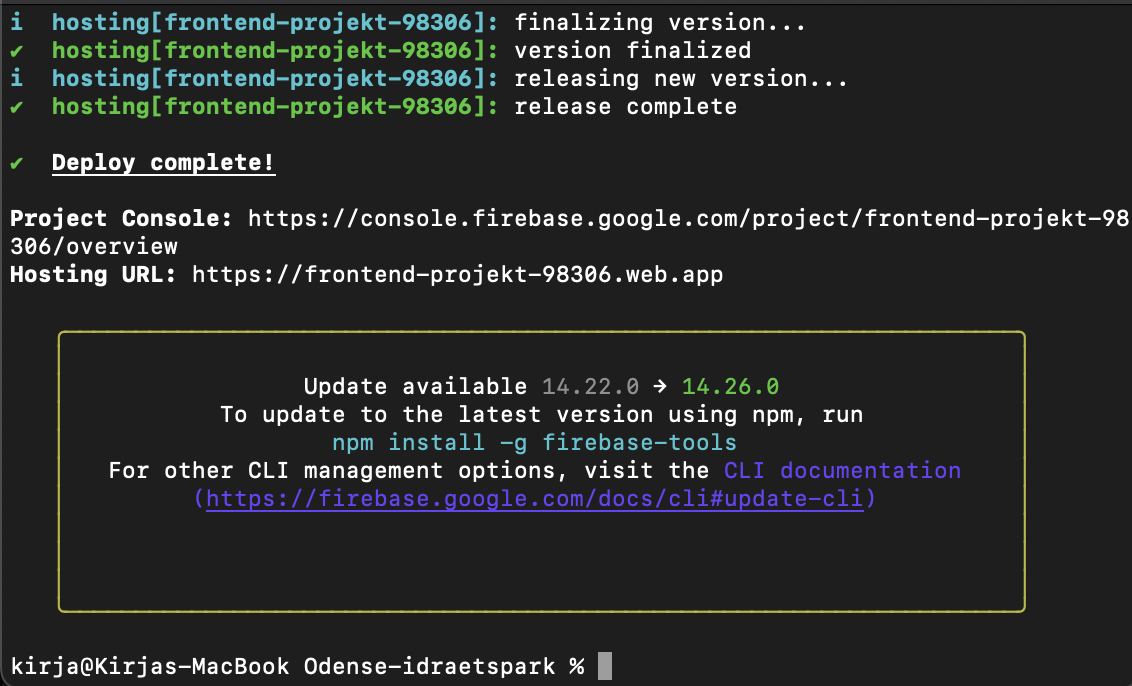 Dette uploadede alle build-filer til Firebase, som derefter hostede den færdige webapplikation online.