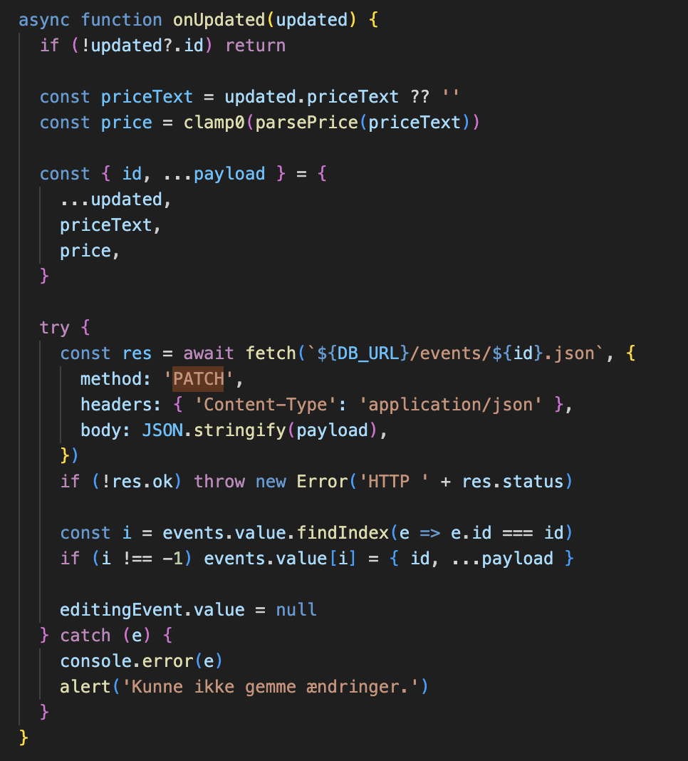 Vi har haft fokus på CRUD-metoden gennem Firebase REST API, hvor akronymet CRUD står for Create, Read, Update og Delete.