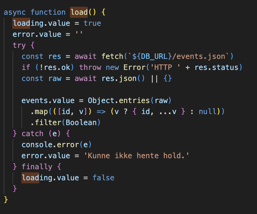 Fordi vi arbejdede med Vue.js, så arbejdede vi med komponenter og views, som gør, at man ikke arbejder med i samme html/template og i samme styling (css), og derved undgår at overrule hinandens kode – som har været en udfordring i tidligere projekter. På den måde fik vi ikke særlig mange fejl og merge-conflicts med GitHub.
