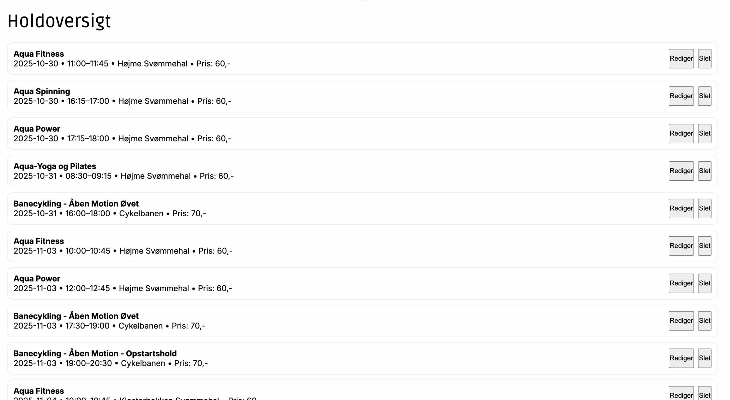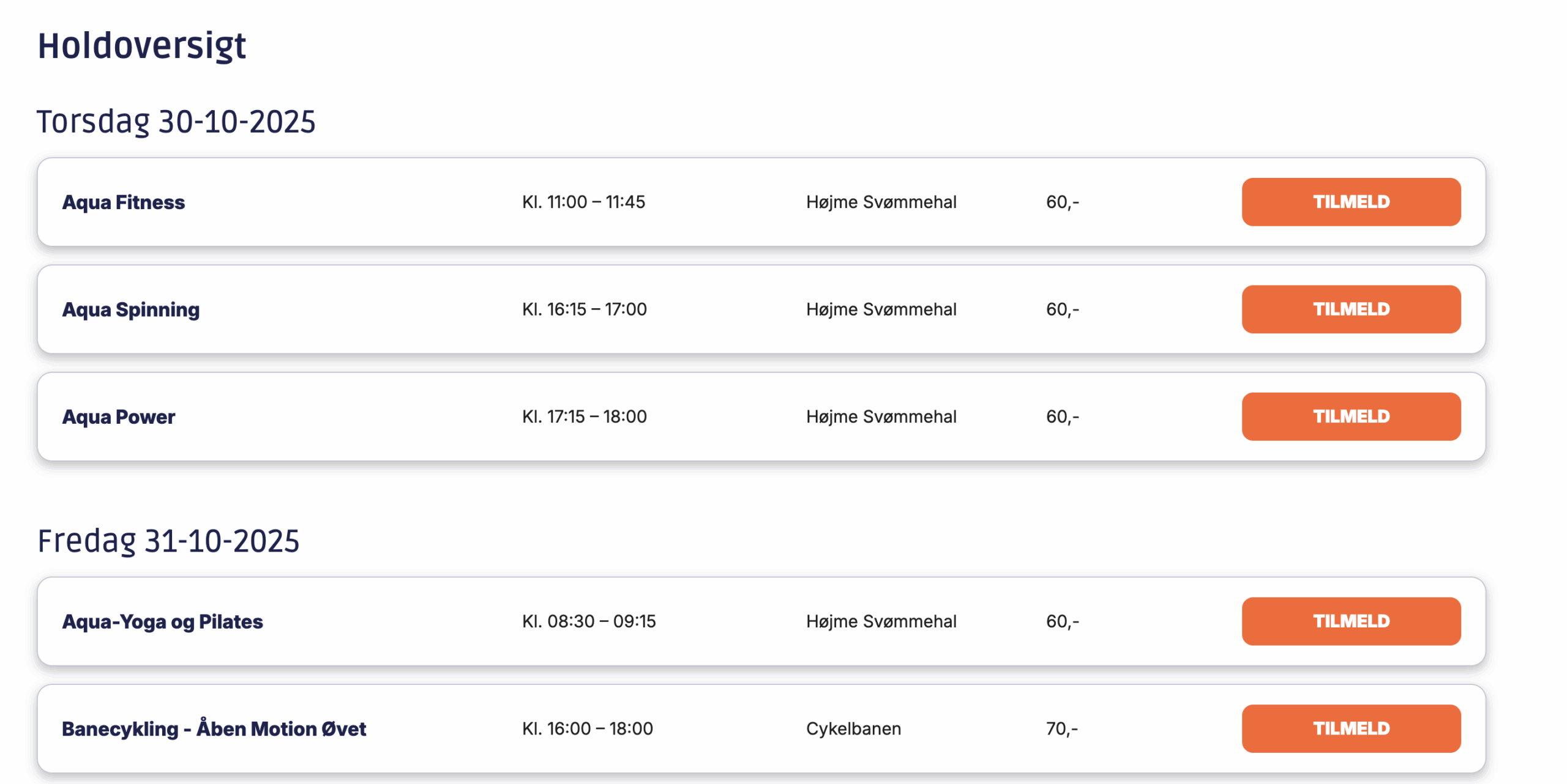 Her ses den oversigt, som brugere ser på hjemmesiden. Her kan de klikke på tilmeld og så afmeld igen.