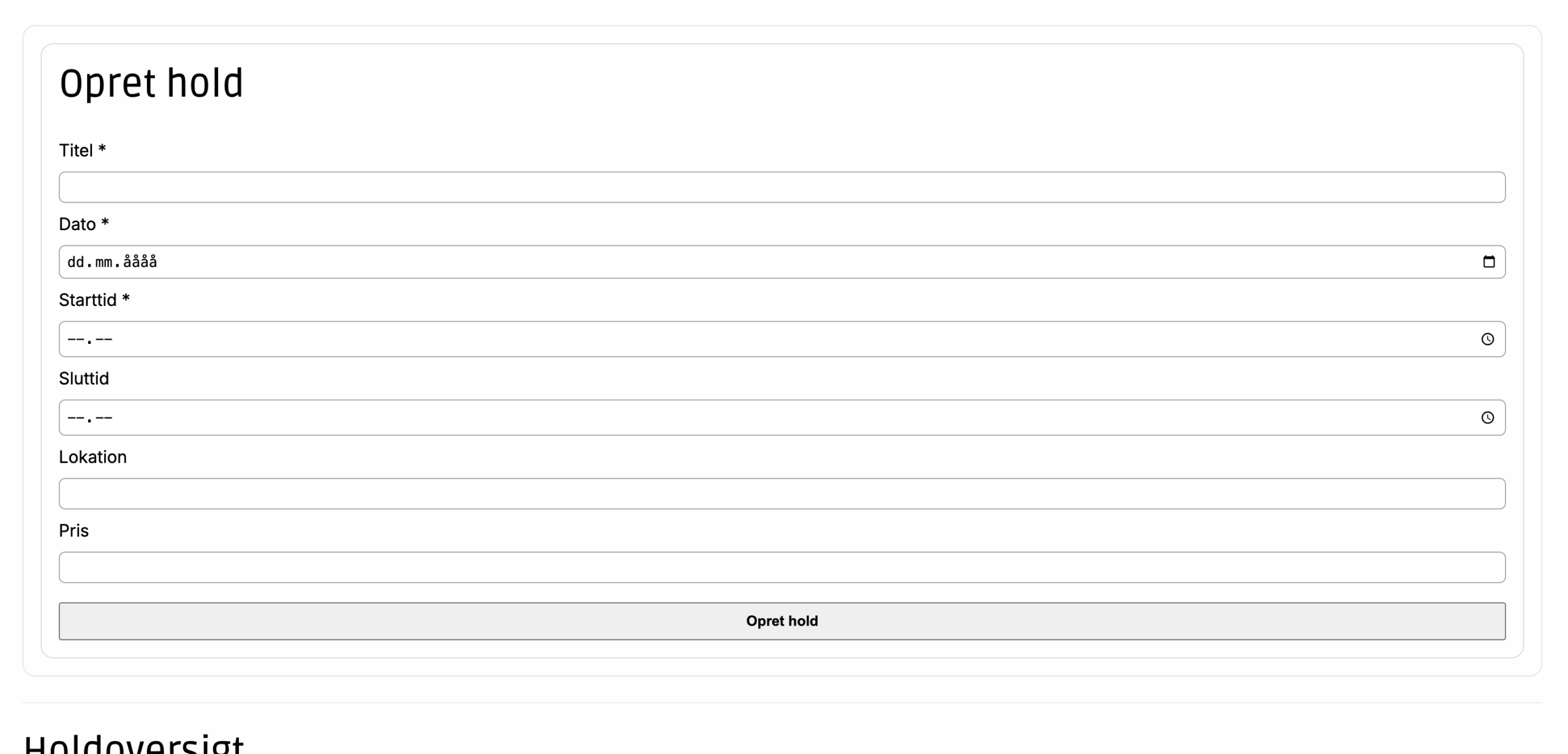 Da det var et krav, at man skulle lave det individuelt, delte vi det op således, at jeg lavede oprettelsesformularen som Odense Idrætspark kan udfylde med events og hold, som så bliver vist på selve oversigtssiden, man som bruger har adgang til og kan booke sig på hold. Mathilde lavede knappen, hvor man kan tilmelde sig og afmelde sig et hold.
